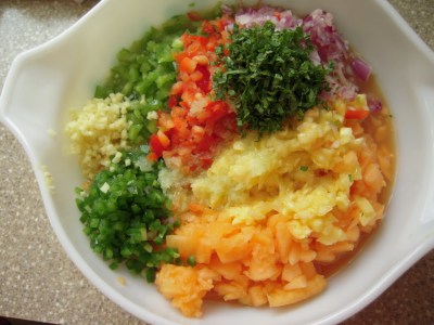 Rough chop the melon, pineapple, bell peppers, and onion. Toss them into a bowl. Mince up the ginger nice and fine (DON’T grate it) and toss it in. Remove the seeds and white membrane from inside the jalapeño, then mince it up and add to the mix.
