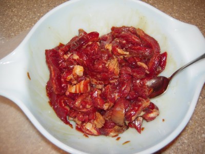 Mix the ginger powder, anise seed, white pepper, and crushed garlic with the Teriyaki sauce. If you don’t have any leftover sauce, that’s OK – I’ve got the link listed in the ingredient list. Follow that link (it’ll open in a new window or tab), and rather than follow the entire recipe (in the interest of time), simply use 1/4 of the amounts listed and mix them together as a marinade instead. It’ll be a little less thick, but should still work fine. Pour over the meat, stir to coat well, and then set aside to marinate for ~10 minutes or so.