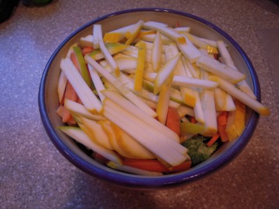 Start out by cutting the flank steak into strips, across the grain, about 1/8″ to 1/4″ thick. It works best if the meat is just on the edge of freezing (to hold it firm)…there are two ways to accomplish this. The right way is to have had the meat out thawing the night before in the fridge, and then to put it in the freezer (unwrapped) for about 30 minutes before starting to prep so it will firm up. The normal way is to realize about 30 minutes before dinner is to be ready that you’ve not planned anything for dinner, then run down to the freezer, pull out a package, and toss it in the microwave on defrost. If the latter is your method, then make sure you turn over the package at the recommended intervals (to avoid actually cooking it), and undershoot the weight (if you have the auto-defrost feature) by 1/4 pound or so so that it is still a bit firm.