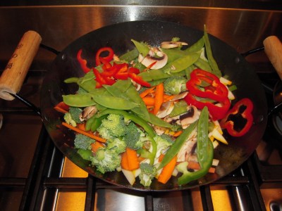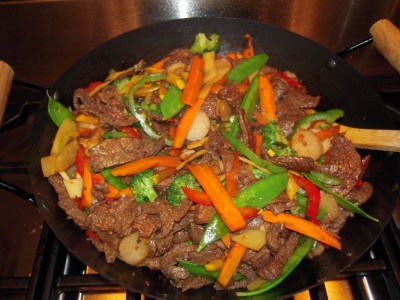 - About the time you’ve got all of the veggies cut up the way you want, your meat should be done marinating. Warm up the wok on medium-high, and melt a couple of tablespoons of coconut oil in there.