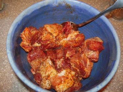 Get your tomato and mango all cut up and into prep bowls. Do the same for the pork, cutting into roughly 1″ chunks and putting into a little larger bowl.