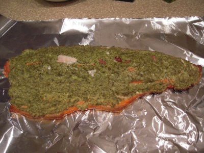 - Spread the pesto paste over the entire top of the fillet. If you have any leftover, eat it with a spoon. Or save it in the fridge for up to a couple of days (it is awesome on an omelette with leftover salmon).