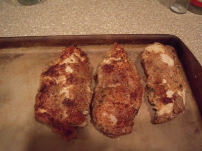 Remove the “tenderloin” part from the breast pieces and flatten with a mallet to about 1/2″ thick. Butterfly cut the rest of each breast in half, and pound out the thick parts to about 1/2″ thick as well. You can trim any smaller loose pieces and use them as “chicken fingers” for the kids if you like.