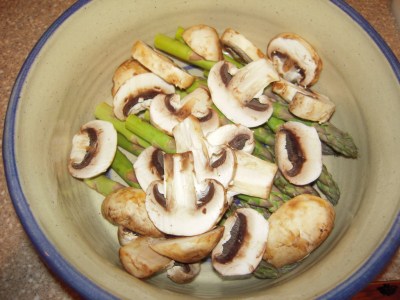 Snap the woody bottom ends of the asparagus off by holding each stalk about half-way down in one hand and at the very bottom end with the other thumb and forefinger. Bend until the asparagus breaks off somewhere in the bottom third of the stalk – discarding the bottom end. This is why you want them to be fresh and firm…limp old stalks will just bend like a wet noodle and will taste mushy and stringy when cooked. Cut the mushrooms into four thick slices each (I slice along side each stem, then split down the center of the stem). Add the mushrooms and asparagus to a bowl large enough to hold everything with room for tossing later.