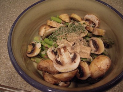 About 15 minutes (depending on how fast your oven heats) before the rest of the meal will be ready, preheat the oven to 450-degrees. Spread the asparagus and mushrooms in a single layer on a baking pan, making sure to scrape all of the little pieces of garlic out and scattering them around the pan as well (my bunch of asparagus was pretty small this evening – normally I’ll have about double this).