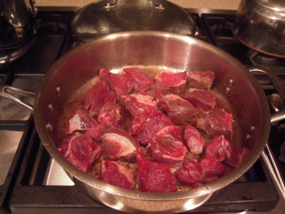 - Add back a tablespoon or two of bacon fat to the pan on medium-high heat, and brown the stew meat pieces in batches. Transfer them to your slow cooker pot as each batch is completed.