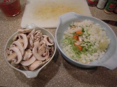 Start out by frying the bacon in a heavy skillet to about medium crisp. While that is cooking, you can go to work on chopping the veggies, mincing the garlic, and slicing the mushrooms. Keep the mushrooms separate from the remaining veggies and garlic. When the bacon is done cooking, transfer to a plate with a paper towel and set aside to cool. Pour the bacon fat into a heat-proof container and reserve for the remainder of the cooking.