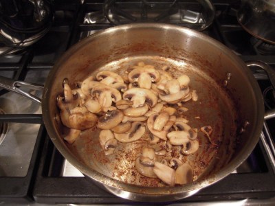 Next, add in some more bacon fat and sauté the mushrooms – working in batches if needed based on the size of your pan. Add more fat if needed to keep them from sticking (they seem to soak it up like a sponge!), and transfer to the pot when done. Remove the pan from heat when complete, for the time being.