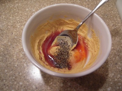 - Now, we turn our attention to our “Dijon” mustard. Place the dry mustard in a small prep bowl, and add a little water at a time while stirring to form a thick paste – maybe 1 to 2 tsp total. This keeps the mustard from clumping when we blend it with the other ingredients.