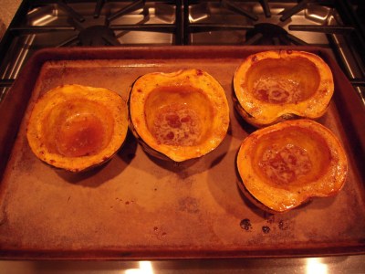 Preheat the oven to 400 degrees. Cut the squash in half and scrape out all of the seeds and stringy stuff. Try, if you can, to cut them in such a way that you end up with two of the “ribs” spaced on either side of the middle of the half – so that they will lay on a baking pan cut side up without falling over. Arrange the halves on a rimmed baking sheet or bar pan – leaning them against each other or making some foil “wedges” if needed to keep them from tipping over.