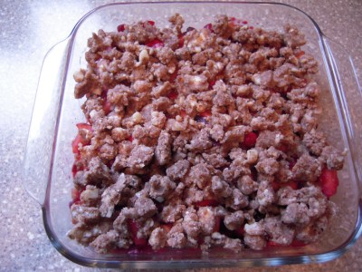 With the exception of juice, it seems that this is the only time that cranberries make an appearance on the menu. For most of the year, these red berries slip from our minds only to come charging back into produce stands in mid- to late-October just in time to get us thinking about the upcoming holidays. They have a distinct, tart flavor that can be overpowering, but that makes them an excellent ingredient for marinading meats. They are also a great accompaniment to sweeter fruits in various medleys and baked desserts, like this one…