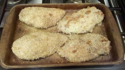 Arrange the three bowls “assembly-line” style starting with the arrowroot, then the egg, and then the coconut. Dredge the chicken breasts through the arrowroot, completely covering every little nook and cranny (don’t skimp here). Next, dip them into the eggs to cover completely, then roll in the coconut mixture until coated with coconut. Arrange on a baking pan (I like to use stoneware). Put in the oven and set the timer for 30 minutes.