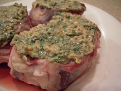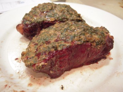 The key with filet mignon is to cook it rarer than other cuts of meat – as it has very little fat or marbling to maintain interior moisture when cooked longer. There are a lot of methods – most involve hot, fast searing on both sides followed by finishing at a lower temperature, often under a broiler. None of them are particularly difficult. In fact, filet requires perhaps the least amount of “prep” of any cut out there. Personally, I like filet grilled; first over direct high heat for a minute or so on each side and then moved over to indirect medium heat until a thermometer reads about 130 degrees in the center. I will usually simply brush the outside with olive oil and give a light sprinkling of black pepper (no salt) beforehand. The other night, however, I thought I’d experiment a little…