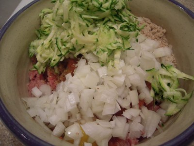 Warm the oven up to 350 degrees. Toss the turkey in a very large bowl. Shred the zucchini and toss it in. Chop up the onions and add them as well. Add in the crushed garlic, egg, almond meal, seasoning blend, and salsa. Got anything else you feel like throwing in, by all means give it a shot…chopped mushrooms, bell pepper, shredded carrot. Whatever floats your boat!