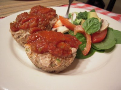 Now comes the fun part – mix that stuff up! Use your hands. Squeeze, mash, knead, and otherwise get messy until everything is well combined and blended. Grab a muffin pan that has 12 cups for standard size (not mini) muffins. Form the turkey/veggie mix into roughly lacrosse-ball-sized balls and plop each one into a muffin cup. If you’ve got any left over meat, add it into a few of the lesser-filled cups. Unless you’ve got a LOT leftover, in which case you must have really gone wild with the veggies and may want to consider adding another 6-cup pan.