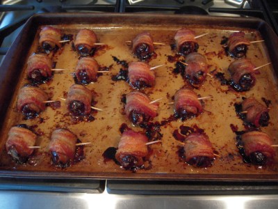 Once you’ve got the dates stuffed, wrap each one with a bacon strip and secure the ends with a toothpick pushed through the center. If you’ve got nuts in the middle of the dates, you’ll have to aim the toothpick to miss the nut…it’s much easier then trying to push the toothpick through the nut. Arrange them on a baking pan with sides (like this 15x10x1 stoneware pan).