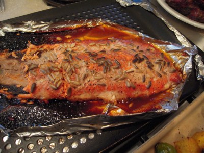 Get the oven or grill warming up to 400 degrees (indirect if grilling). Grab a shallow baking dish large enough to hold the salmon, then line it with aluminum foil with the shiny side down (i.e. NOT facing the food). Alternately, if grilling, you can simply make a “pan” out of a doubled up piece of foil (start with a piece twice as long as the fillet PLUS about 4 inches, then fold in half and work the edges up to form a rim like I have above). Place the fish on the foil, then drizzle generously with the honey-dijon sauce. Sprinkle pine nuts over the surface of the fish.