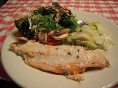 Bake in the oven until the fish is just flaky with a fork but still firm and moist (about 40 minutes). Serve with the leeks and onions on the side, and anything else you feel like having with it. Enjoy!