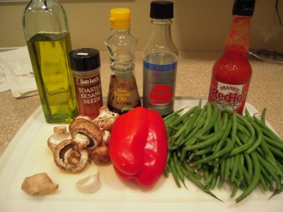 - Start out getting the green beans snapped, and the pepper and mushrooms cut up and separated so you can add them at appropriate times.