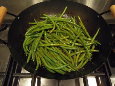 - Toss in the green beans and start to sauté with a bamboo spoon.