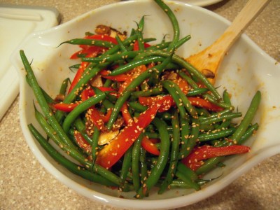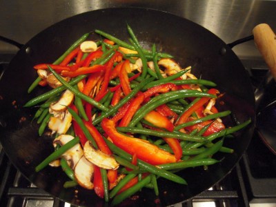 Toss in the green beans and start to sauté with a bamboo spoon. Continue cooking and turning for about 4 minutes – until the beans are starting to warm through but not soften yet.