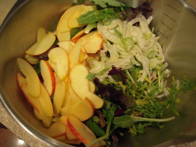 - Combine the greens, arugula, apple, and fennel in a very large bowl. You need room to toss everything without making a mess.
