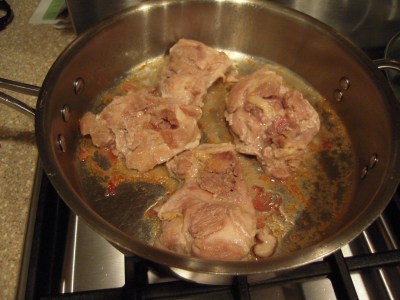 Heat the coconut oil in a large deep frying pan on medium heat. When the oil is hot, place the chicken thighs in and cook, turning every 5 minutes or so, until just cooked through. You can put a lid over the pan for the first 5 minutes to help in cooking them a little faster if you are in a hurry (since this is the longest step of the recipe). When the chicken has cooked all the way through, transfer to a cutting board to cool a little, then cut up into roughly 1″ pieces.