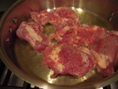 Preheat the oven to 450 degrees. Sprinkle both sides of the chicken thighs sparingly with sea salt and pepper. Heat about 1-1/2 tbsp olive oil in a heavy sauté pan over medium-high heat. When warm, partially cook the chicken in batches on one side only until that side is browned (about 5 minutes). Set each batch aside until all the chicken has been cooked on one side, adding more olive oil to the pan as needed to prevent sticking.