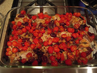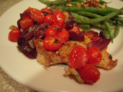 With tomatoes, garlic, oregano, and kalamata olives, this dish is full of flavor despite having only a few ingredients. It is also both simple and fast to make – perfect for the middle of the week when you’re running out of steam and want to get something on the table without a lot of effort. Combine it with our green beans from yesterday, and you’ll have a complete meal on the table in about 45 minutes (assuming you’ve got the chicken thawed out ahead of time).
