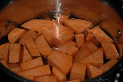 Add sweet potatoes and salt to water-filled pot and bring to a boil until potatoes are soft.