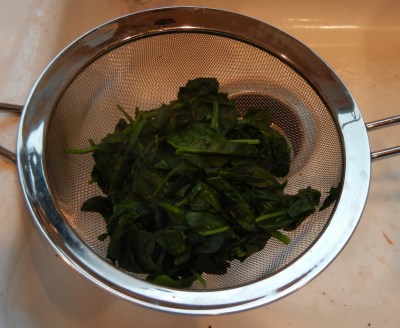 Preheat the oven to 350 degrees. Get a large sauce pan heating on medium-high heat, then toss in the spinach and cook – stirring constantly – until it has been wilted and reduced to a dark wet mass the size of your fist in the bottom of the pot. Turn off the heat and transfer the spinach to a mesh sieve or strainer and let drain and cool.