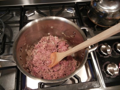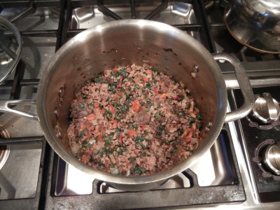 In the same saucepan you cooked the spinach, return it to the burner over medium heat. Pour in 2 tbsp of olive oil, then add the onion and garlic and cook for about 60 seconds. Add the ground meat and continue cooking until it is browned. While it is cooking, squeeze as much moisture as you can out of the spinach (work in golf-ball sized chunks to get a better squeeze on it), then transfer to the cutting board and chop it all up very well.