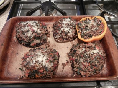 Carefully spoon stuffing mixture into/onto the mushroom caps (how much is in versus on will depend on how deep the original caps were). Make sure to mound it up well above the cap. Since I had enough stuffing for six (or more) mushrooms, but was only able to buy four, I also grabbed a bell pepper out of the fridge and stuffed it too! Lightly sprinkle the tops with sea salt, black pepper, and then a little almond meal (looks a bit like parmesan to the untrained eye).