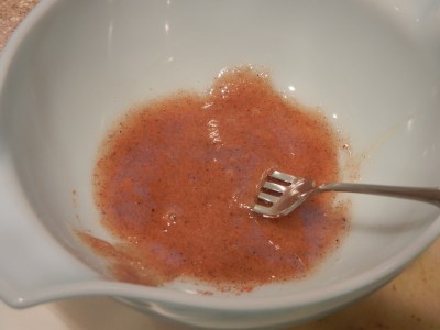 While the nuts are cooling, whisk together the olive oil, rice vinegar, minced shallots, and reserved cardamom/cloves/salt blend. Set aside, whisking again every so often to keep things mixed up well.