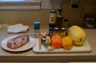 Start the oven to 400. Split the squash and scoop out the seeds, then place it cut side down on a baking pan. Put in the oven and set the timer for 30 minutes. Meanwhile, get the veggies all chopped and separated into prep bowls. You can also work on chunking up the pork (if you have boneless, this goes much faster).