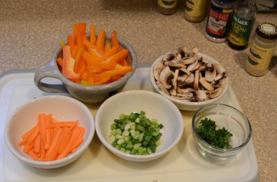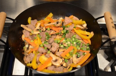 Add the carrots, mushrooms, and bell peppers to the pan and continue to cook for another 3 or so minutes. Stir often, and shoot for a tender-crisp finish on the veggies. Just as they are close (perhaps after 2 minutes), add in the white and light green parts of the scallions and cook those a little as well. After cooking for a minute longer with the scallions, reduce the heat to simmer before continuing.