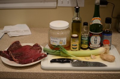- 3 lbs round steak or other economy cut of grass-fed beef, sliced lengthwise into 1/2″ x 3/4″ wide strips
