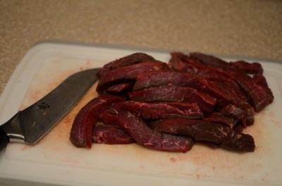 Start out cutting the beef into long strips. I like to make mine a bit thicker – using a 3/4″ thick steak and cutting it 3/8″ to 1/2″ wide in long pieces. You may prefer to cut the steak thinner, especially if using flank steak or London broil. Once all the meat is cut, you can set it aside for a little bit while we move on.
