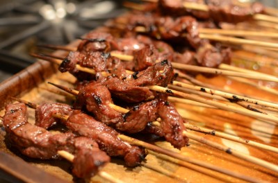 The next day, prepare the bugachi by threading the meat onto bamboo skewers. Stack them all up and let come to room temperature while you warm the grill up to medium-high heat (I went for 400 on the pellet grill).