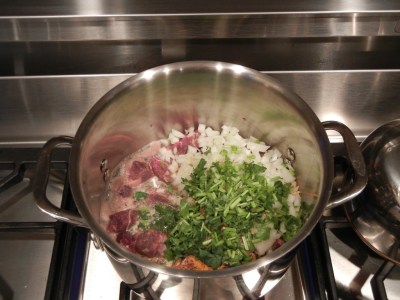In a large stock pot, throw in the stew meat. Add in the onion, garlic, ginger, paprika, cumin, turmeric, pepper, salt, mint, and cilantro stems. Pour the water in and give everything a good stir to combine. Bring the whole thing to a boil, then reduce the heat to a simmer and cover with a lid. Let cook on a low simmer for about 1 to 1-1/2 hours until the stew meat is tender. Option: you could choose to do all of this in a large crock pot and let cook on low for about 4 hours instead.