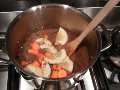 Once the meat is tender, add in the carrots and lemon slices and stir to ensure they are fully covered in liquid (add some more water if needed). Cover and cook for about 10 more minutes. If you are using the crock pot, combine this step with the next step and let everything cook for about 30 minutes total.