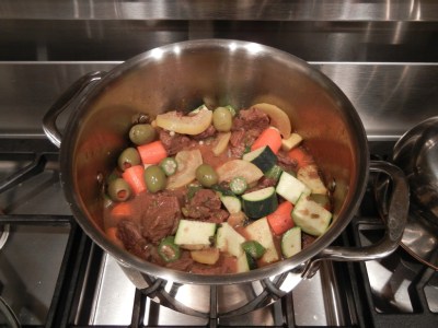 Next, add in the zucchini, okra, olives, and lemon juice. Stir again to mix everything well (add a little more liquid if necessary for everything to be just about covered), then put the lid back on and continue to simmer for another 10 minutes or until the zucchini and carrots are just tender.