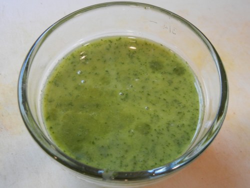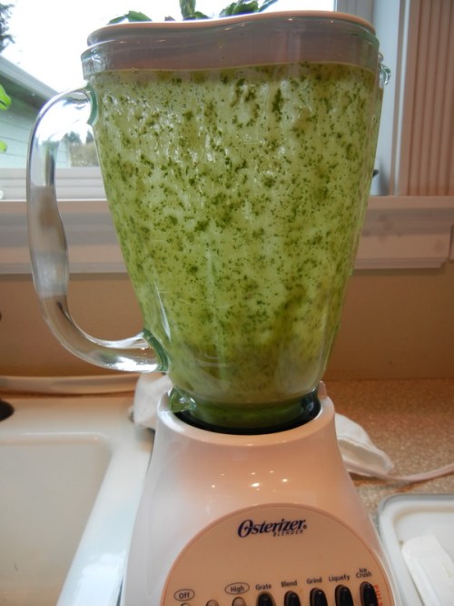 Put everything into the blender and give it a whirl. Continue blending for 15~20 seconds, then stop and scrape down the sides good with a spatula. Blend again for another 15~20 seconds, or longer if needed to get the mint chopped up very fine and everything smooth.