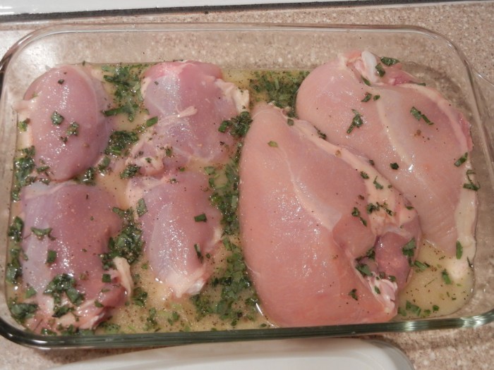 Arrange the chicken pieces in a 13×9 glass (non-reactive) baking dish and pour the marinade ingredients over the top. Lift each piece slightly with a fork or tongs to let some of the marinade underneath, then set back in the pan. Cover with plastic wrap or a lid and place in the fridge. Refrigerate at least 8 hours, turning the pieces once about half-way through. For simplicity, I made this up the night before, and turned everything in the morning before I left for work.