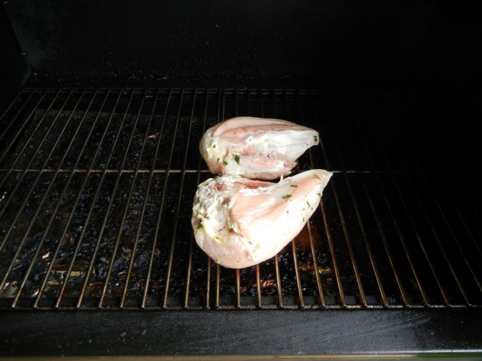 Remove the meat from the refrigerator about 30 minutes before cooking to allow it to warm up closer to room temperature. Preheat the grill to medium indirect heat (about 320 degrees) and clean the grates. When the grill is heated up, place the two breasts on first, meat side down, for 20 minutes.