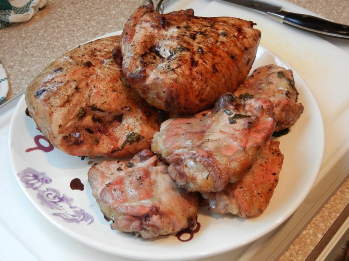 After the first 20 minutes, turn the breasts over and place the thighs on the grill as well. Continue cooking, turning the pieces every 10 minutes, until a quick-read thermometer inserted into one of the breasts reads 165 degrees (about an hour from when the breasts started).