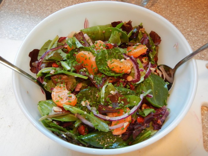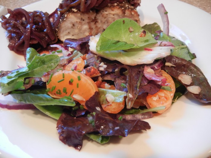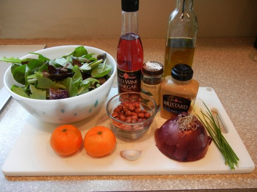 This is a tasty and easy salad to throw together for just about any meal. The sweetness of the mandarin oranges blends perfectly with the bite of red wine vinegar in the dressing, while roughly chopped hazelnuts (filberts for those native to the PNW) add just a little crunch for texture.