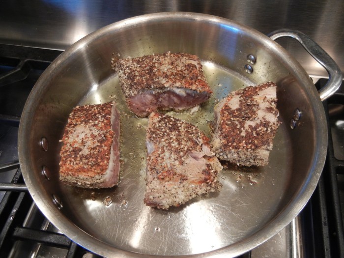 When both sides of the tuna are seared, transfer to a baking pan and place in the oven for a few minutes longer (depending on how “done” you like your tuna). Shoot for an internal temperature of about 125 degrees for one of the steaks for a nice “medium rare” finish – which was about 4 minutes in the oven after they were seared for my “steaks.”