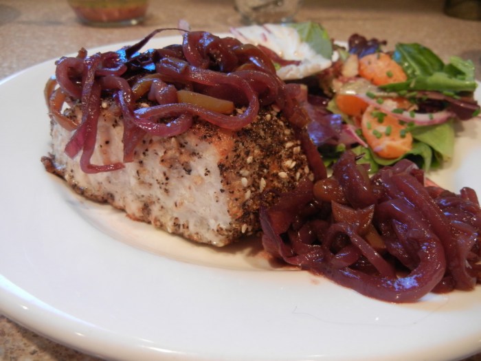 It’s been a while since I pulled out some of the tuna fillets we have in the freezer from the incredible fishing trip I took last August. So the other night, I thought it would be a good time to try something different. I started with the basic idea of tuna seared with a wasabi crust and added a new relish of red onions “jellied” in a combination of different vinegars until they are soft, sweet, and tangy all at once.