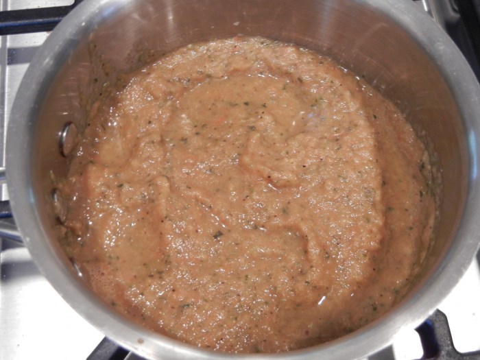 Immediately place the chile in a medium bowl and cover tightly with foil or plastic wrap. Next, place the onions, tomatoes, and all other ingredients into a blender and puree. After a minute or two in the bowl, remove the chile and peel the skin from it (if you charred it will, it should almost fall off at this point). Cut the stem off the chile (remove the seeds if you like), then add to the blender and puree with the rest of the ingredients until smooth – about 1 minute. Pour the entire mixture into a small sauce pan.
